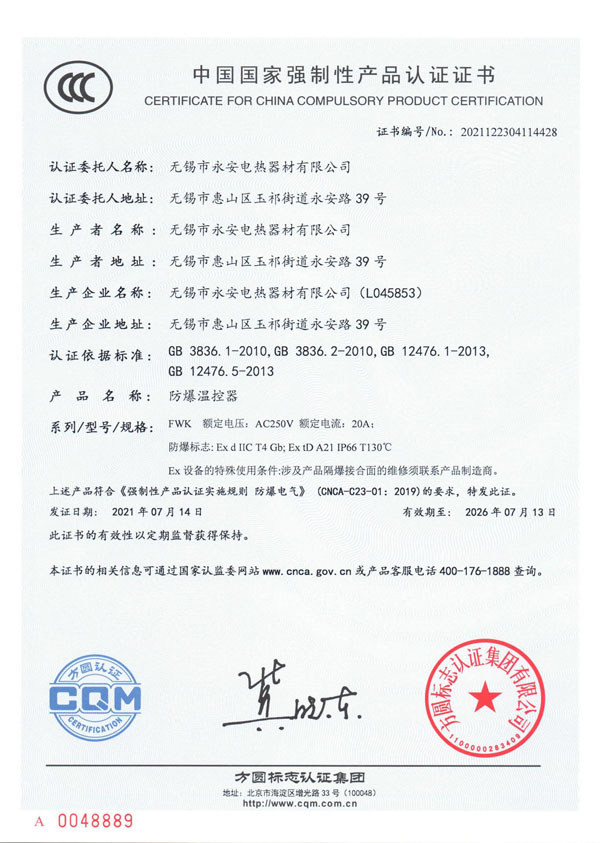 CCC證書-防爆溫控器