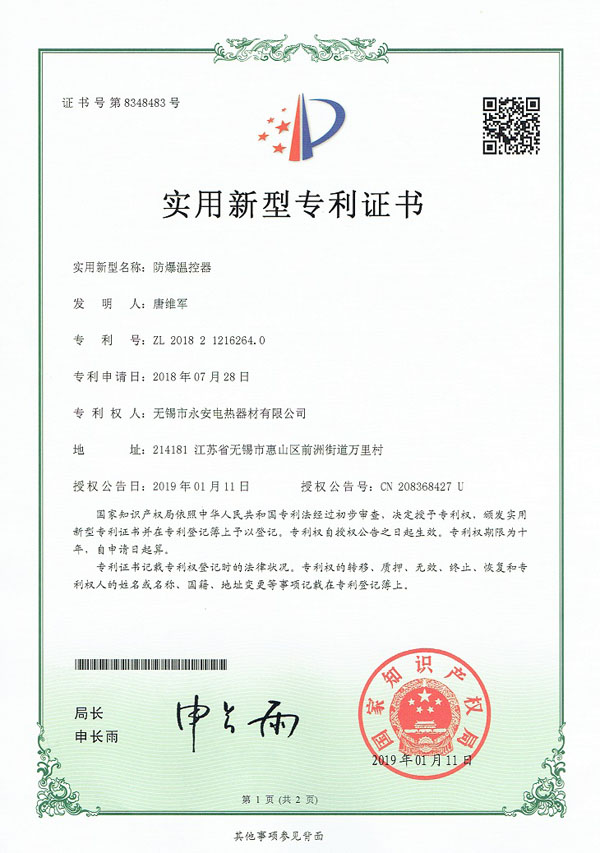 專利實用-防爆溫控器