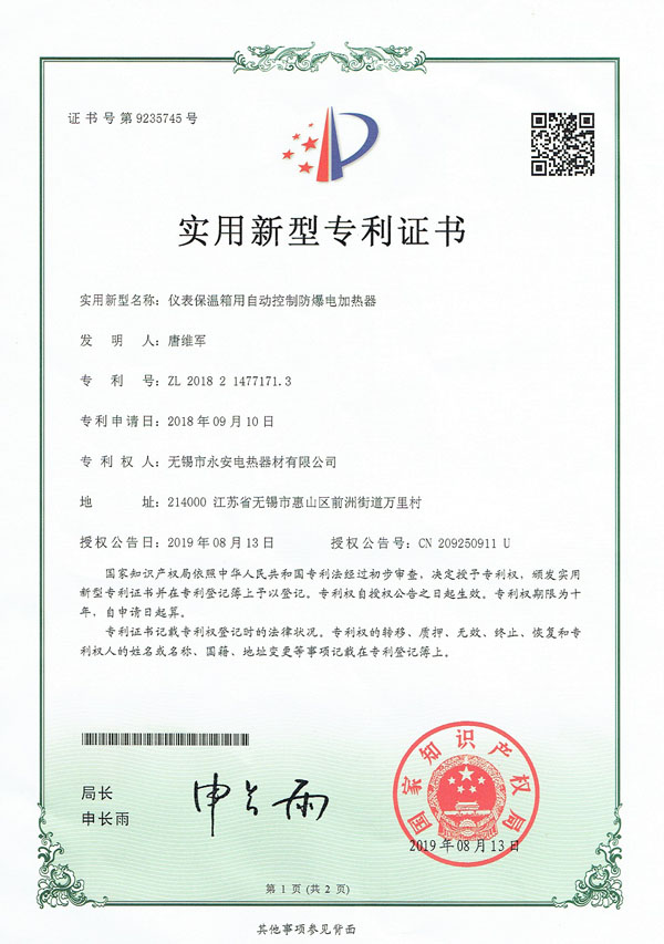 專利實用-箱體防爆電加熱器